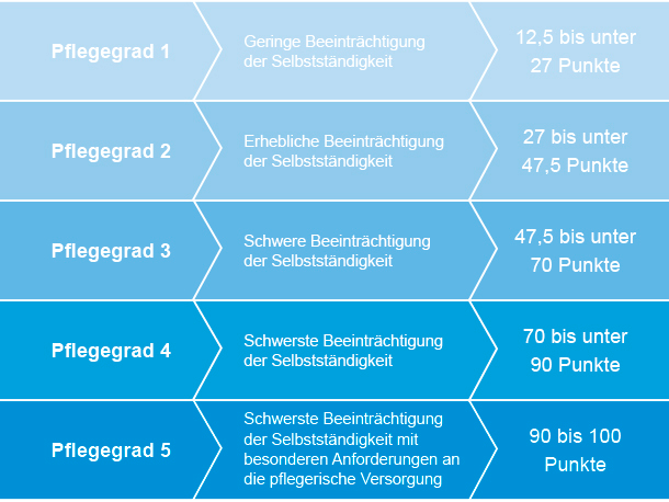 Fünf Pflegegrade ermöglichen es, Art und Schwere der jeweiligen Beeinträchtigungen unabhängig davon, ob diese körperlich, geistig oder psychisch bedingt sind, zu erfassen. Die Pflegegrade und damit auch der Umfang der Leistungen der Pflegeversicherung orientieren sich an der Schwere der Beeinträchtigungen der Selbstständigkeit oder der Fähigkeiten der pflegebedürftigen Person.