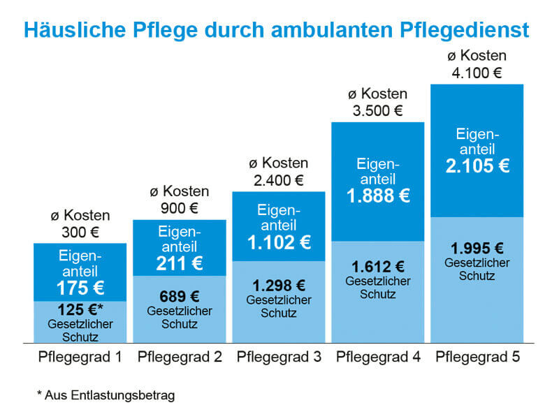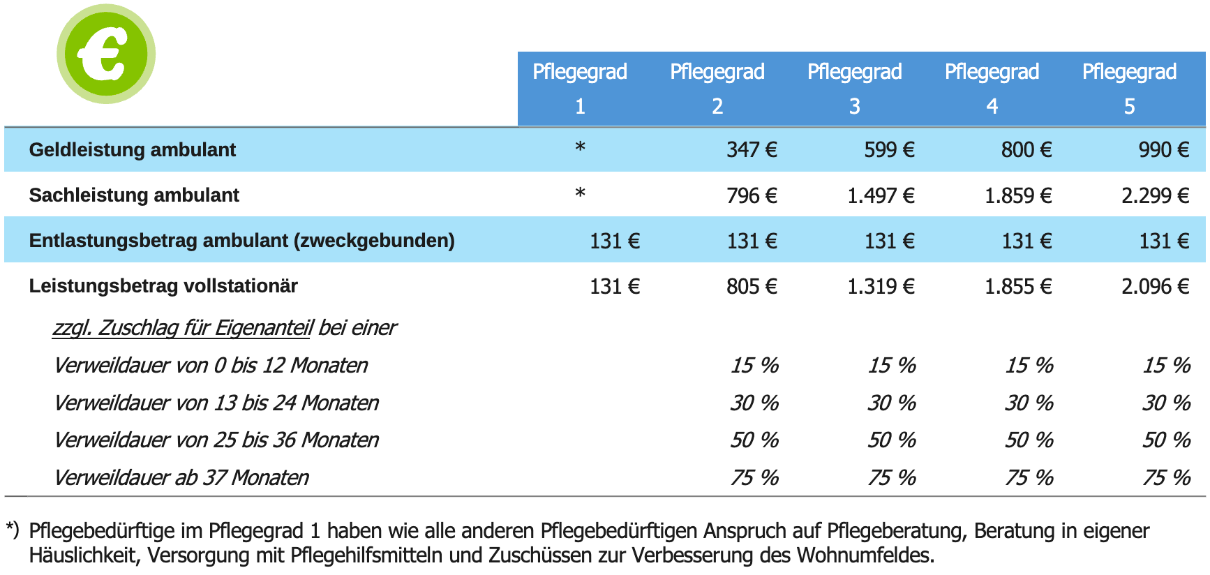 Entscheidend für die Höhe der Leistungen ist die Art der Pflege und der vorliegende Pflegegrad, welcher durch den medizinischen Dienst der Krankenversicherung festgestellt wird.